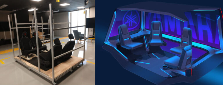 This brings new challenges for vehicle design teams as they will need to develop new spaces and workflows that enable the creation of experiences that physical models can’t simulate. The new Future Mobility Center at the Ullman School of Design (University of Cincinnati) is a glimpse into the next iteration of vehicle design studios. The space is composed by a collaborative workspace that enables multidisciplinary work, an advanced visualization lab for traditional 2D development future concepts, and a space that mixes virtual reality development with physical prototyping. Vehicle interiors are created in virtual reality while the designer sits in a physical interior buck. Items generated to detail in immersive sketching tools such as Gravity Sketch, can be swiftly validated in the real world in a low fidelity prototype. The virtual geometry generated is refined into final CAD models that can be programmed into game engines to simulate interactivity and scenarios such as lighting, sound, and even a ride in a virtual city. High-fidelity virtual simulations on low-fidelity interior bucks reduces the amount of iterative, high-fidelity physical prototypes, streamlining the process and showing other aspects of the ride experience beyond the physicality of the vehicle.