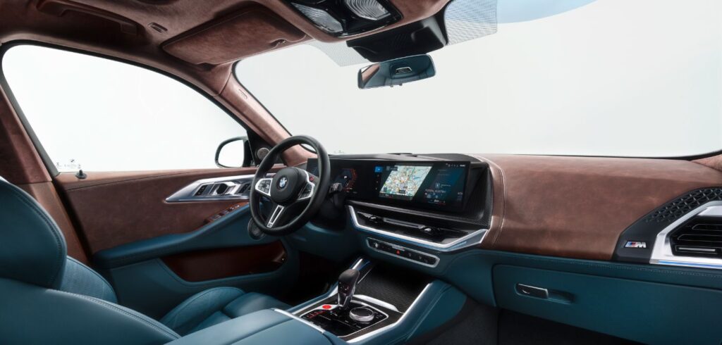 High-quality interior surfaces adorn the cockpit, with BMW’s Curved Display placed on a matt carbon surface which also features on the vehicle’s center console. Carbon elements are fitted within the instrument panel and contrast the wide, pearl-effect chrome air vent surrounds.