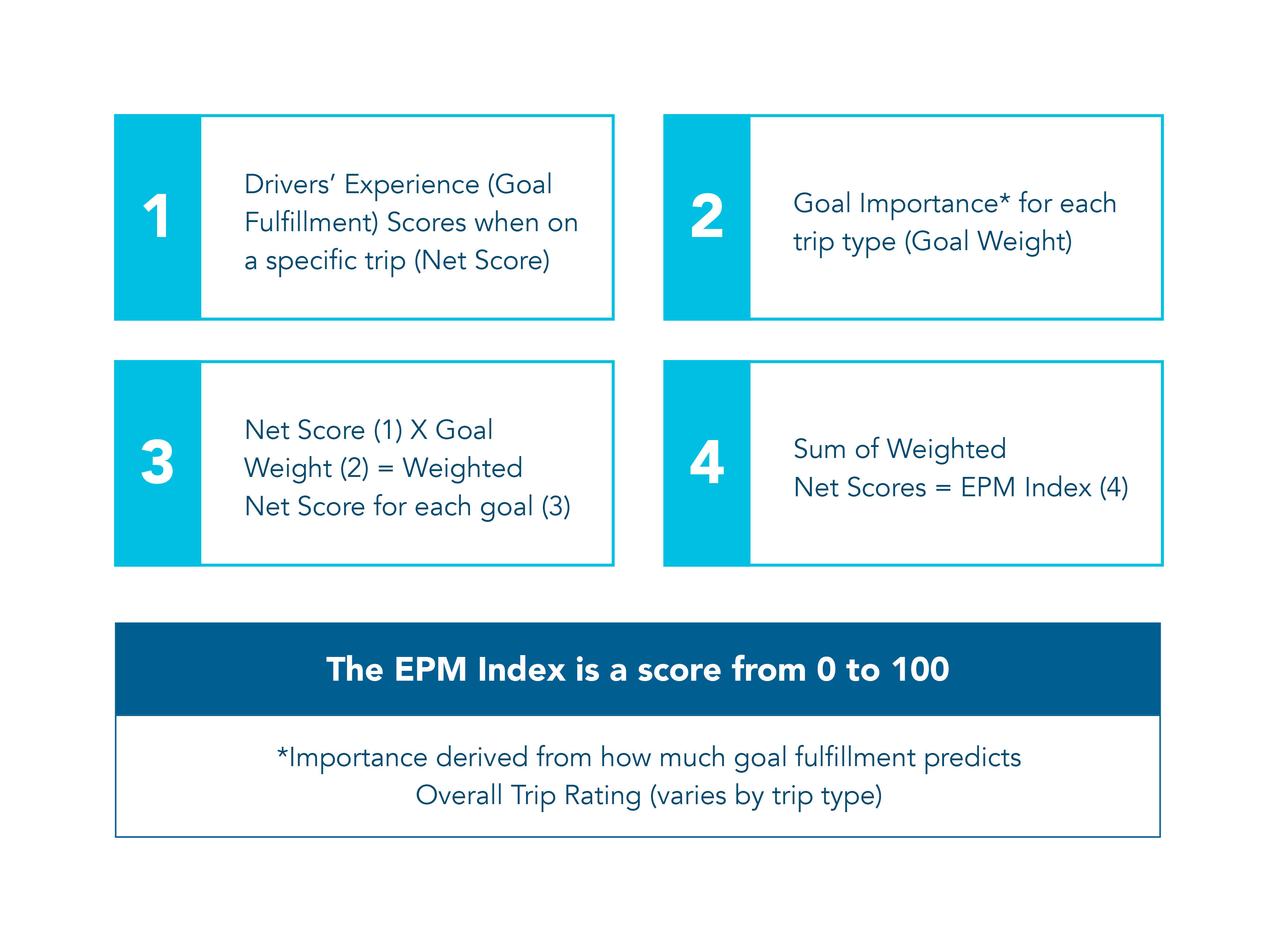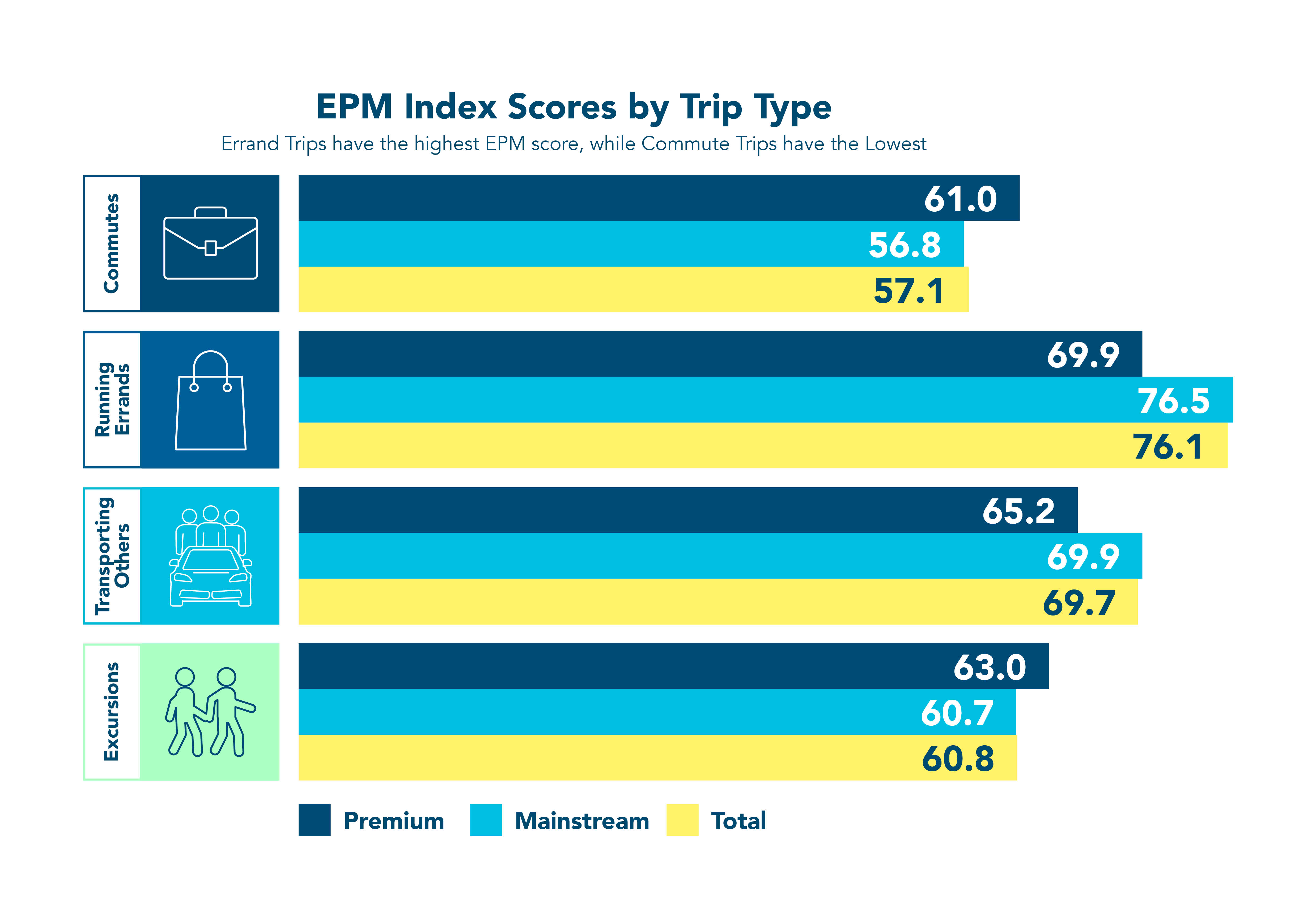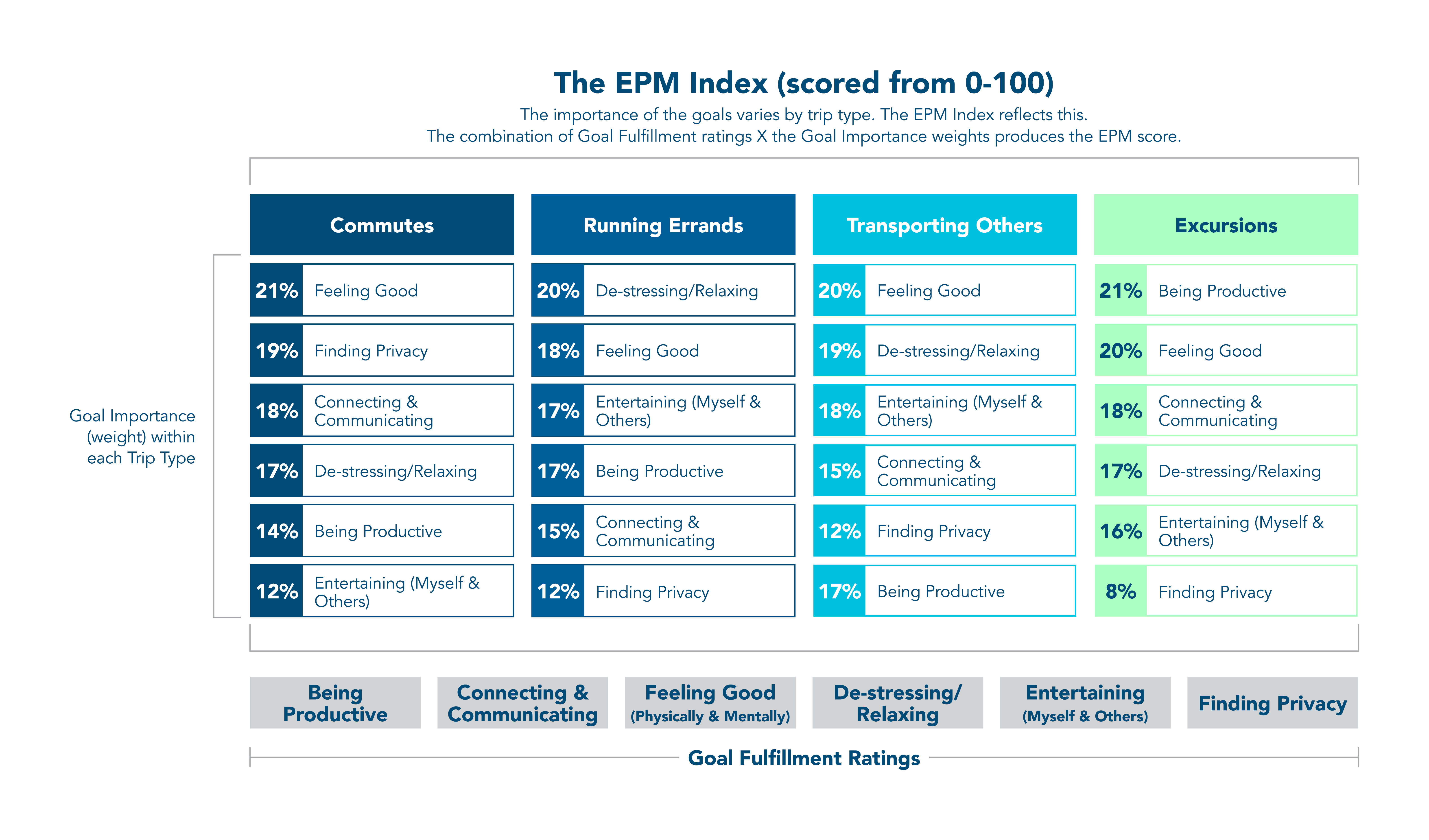 The EPM Index scores vehicles from 0-100 based on a user’s experience goals for different journeys and trip types. The metric is based on research conducted by IPSOS, in which users scored vehicles on how well their individual goals for a particular journey were achieved. This net score is multiplied by the importance, or weighting, that goal has for the trip type. The sum of the weighted scores then equates to the vehicle’s EPM Index.