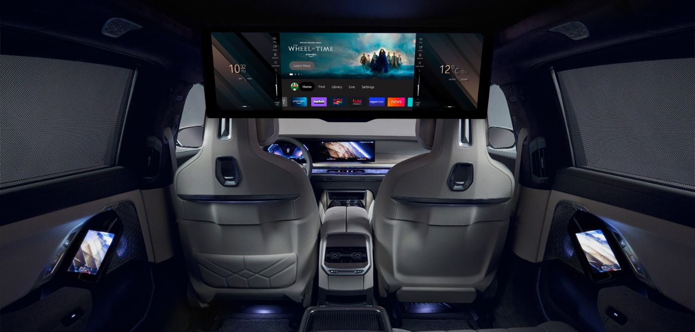 The Theatre Screen spreads out horizontally across virtually the full width of the interior and extends down from the headliner to the front seat backrests. It folds into the ceiling when not in use, and can be moved closer or further from the rear passengers to put it within arm’s reach for touch controls or to maneuver it to the preferred viewing distance.