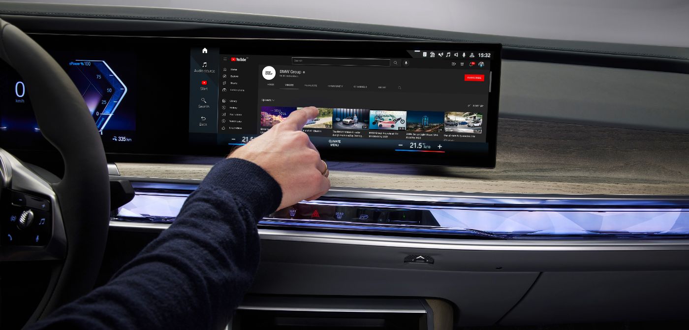Up front, the driver’s display consists of a 12.3in information display behind the steering wheel and a 14.9in control display in the center. Arranged beneath a shared glass surface, the displays are directed ergonomically toward the driver. BMW’s ‘Interaction Bar’ also makes its debut as a new kind of control/operation and design element. This functional unit, which sports a crystalline surface structure and backlighting, extends from below the trim strip across the full width of the instrument panel and well into the door panel trim. It houses touch-sensitive control panels for adjusting the ventilation and climate control, activating the hazard warning lights and opening the glove compartment. The light design of the BMW Interaction Bar takes its cues from the color world of the My Mode setting currently selected and can also be set as desired by the user.