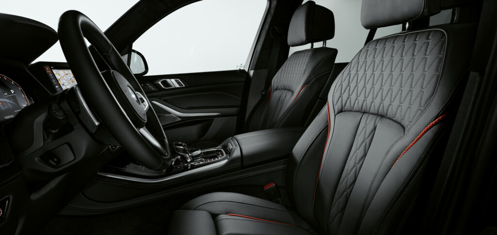 BMW’s full leather trim in Merino Black is also offered as standard, and additionally enhanced by edition-specific red contrast stitching for the driver and front passenger seats. The edging on the front and rear floor mats is also finished in red; inside the BMW X5 Black Vermillion, the red accents are also to be found on the rear seats.